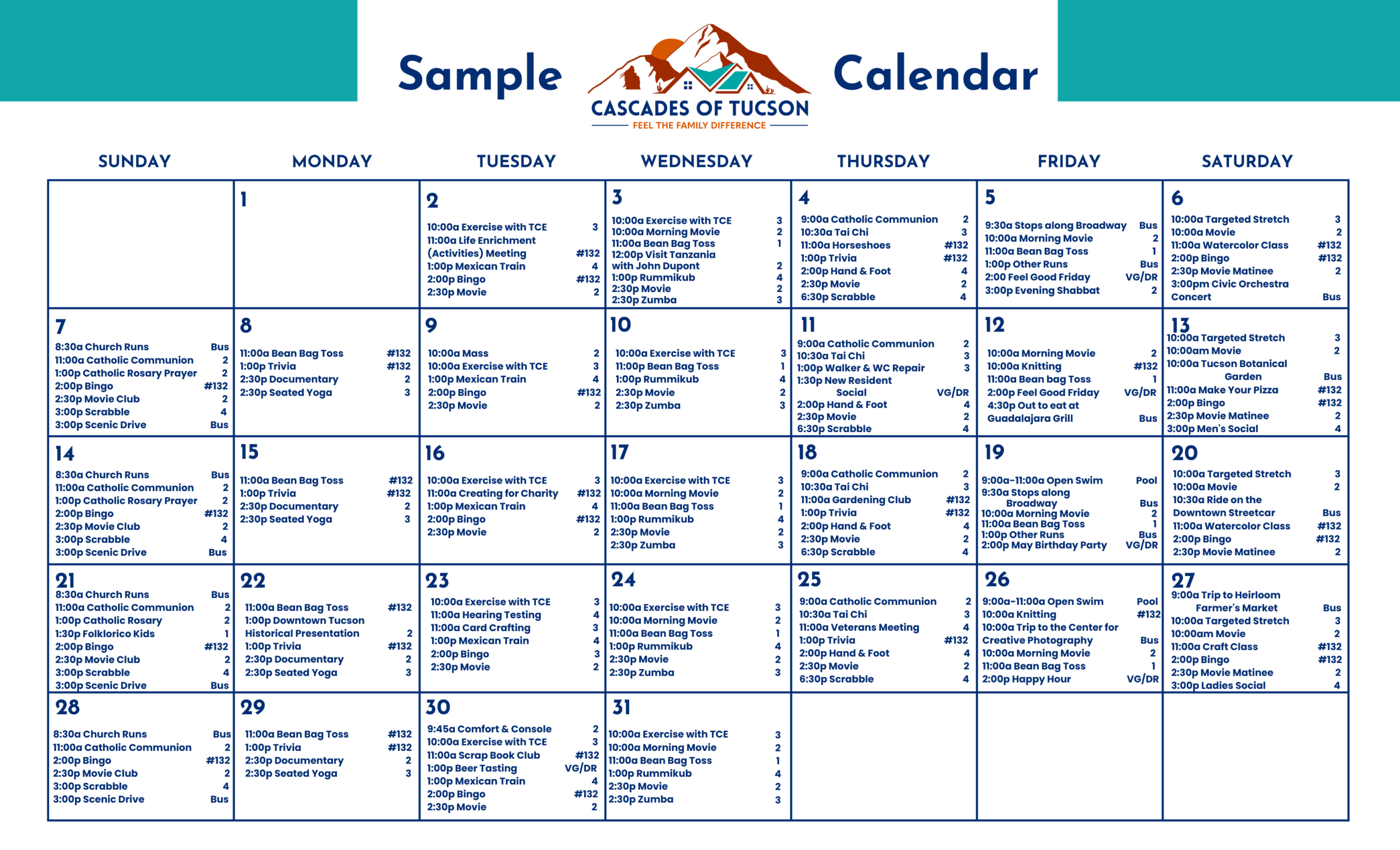 At Cascades of Tucson, our life enrichment programs are unique because they are all developed in-house, based on suggestions from our residents. Unlike other senior living communities that follow standardized corporate programming, we have the freedom to create and tailor programs that truly meet the needs and interests of our community. Our homegrown programs ensure that our residents have access to activities and events that are truly meaningful and enjoyable to them, enhancing their overall quality of life.
